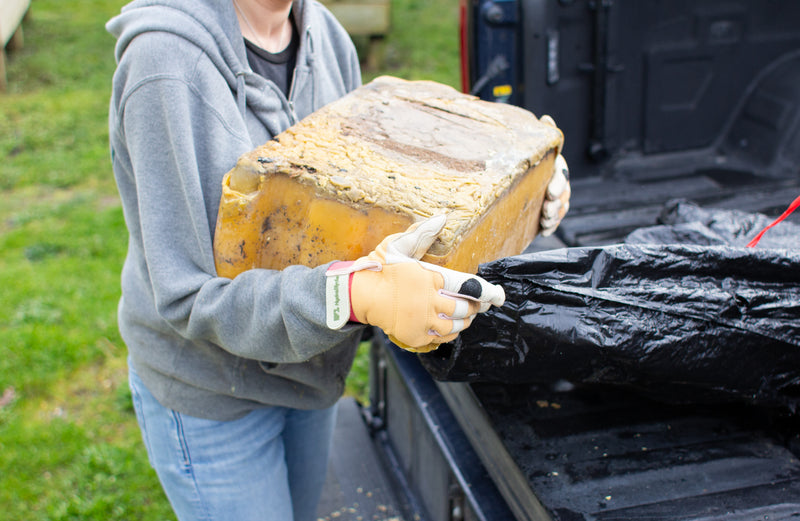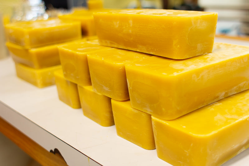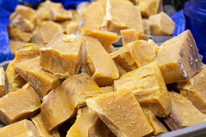 We get our beeswax directly from local apiaries, and it comes in large blocks of partially filtered wax. Partially filtered simply means that the beekeeper cleans the wax to remove any large chunks of course honeycomb, propolis, etc. Smaller debris (such as dirt, pollen, etc.) are left that need to be cleaned out with a much finer filter.