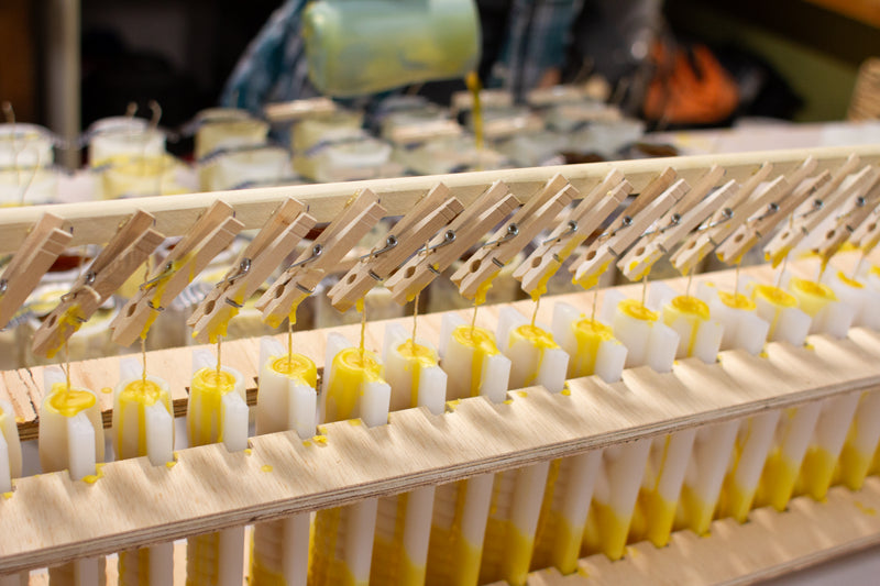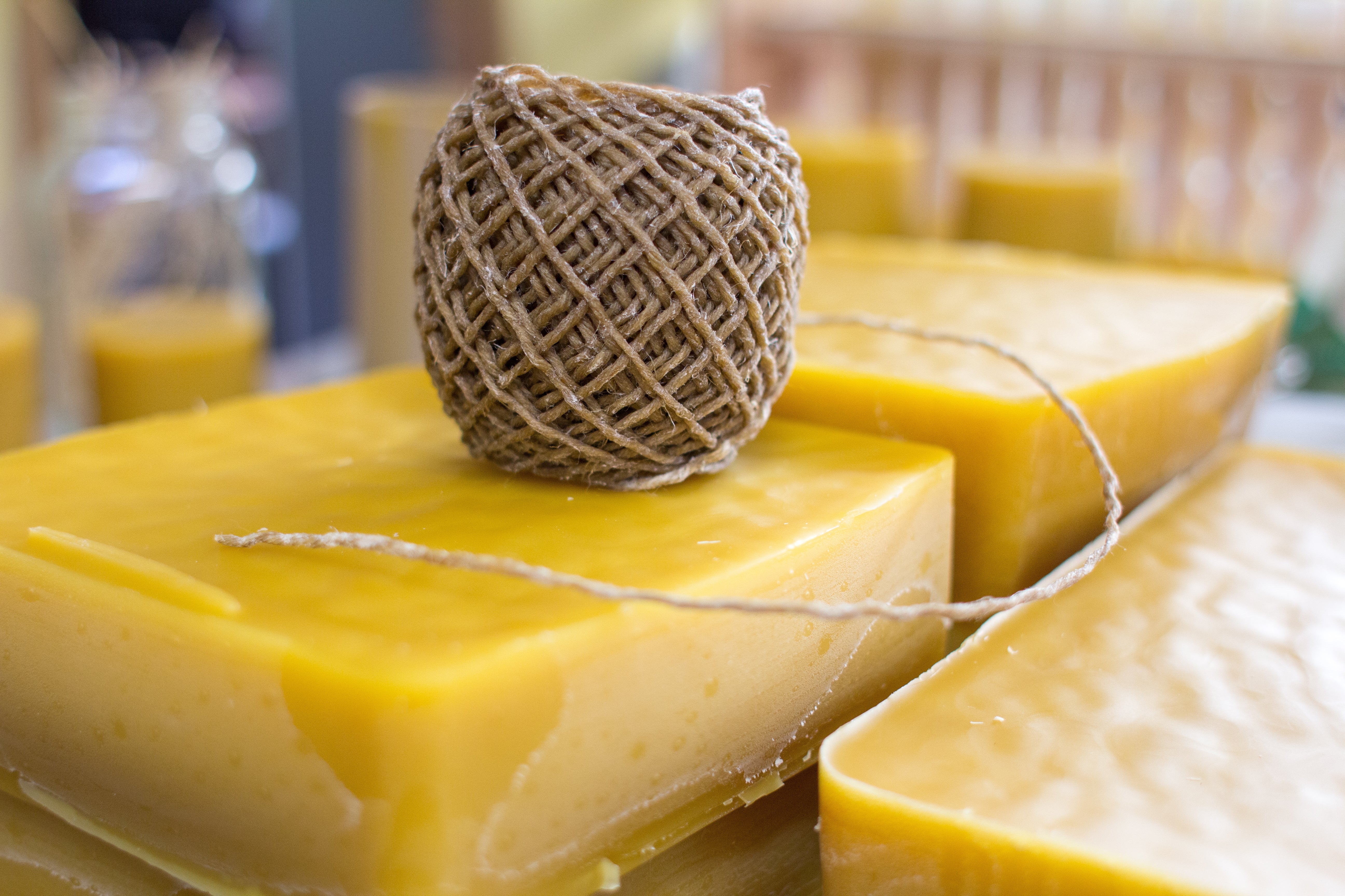 The first step is to clean it up so you don’t get debris in your candles! This involves chopping up the blocks into smaller, more manageable chunks, melting it down in one of our large commercial wax melters, and then filtering it again through a triple layer of cheesecloth. This gives us the golden bricks of pure, filtered wax for candles. Once those bricks are cooled, we put them into our second commercial wax melter (aptly named the “clean” pot) and then we can pour that beautiful liquid gold into the molds fitted with our hemp wicks! It’s a messy, labor of love with an end result that is immensely gratifying as a candle maker.